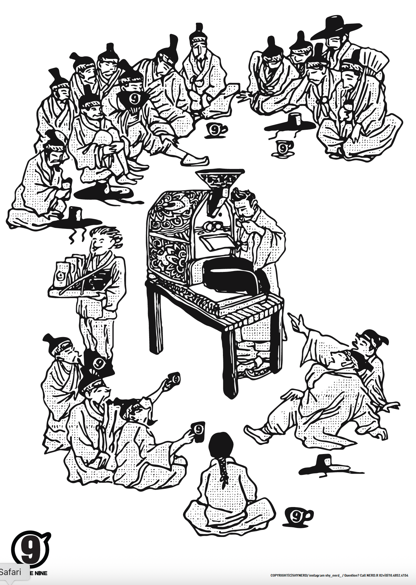 This illustration was commissioned by Coffee 9 and reimagines traditional Korean minhwa (folk painting) through a contemporary lens. Drawing from the visual language of historical group scenes, the work playfully parodies classic motifs while translating them into a modern context connected to everyday coffee culture. The figures are rendered with simplified forms and bold black-and-white contrast, preserving the communal spirit and narrative density of traditional minhwa while introducing contemporary symbols and branding. This blend of old and new reflects how cultural heritage can remain alive through reinterpretation rather than replication. By modernizing a familiar visual tradition, the illustration bridges past and present, inviting viewers to experience Korean folk imagery in a fresh and accessible way.