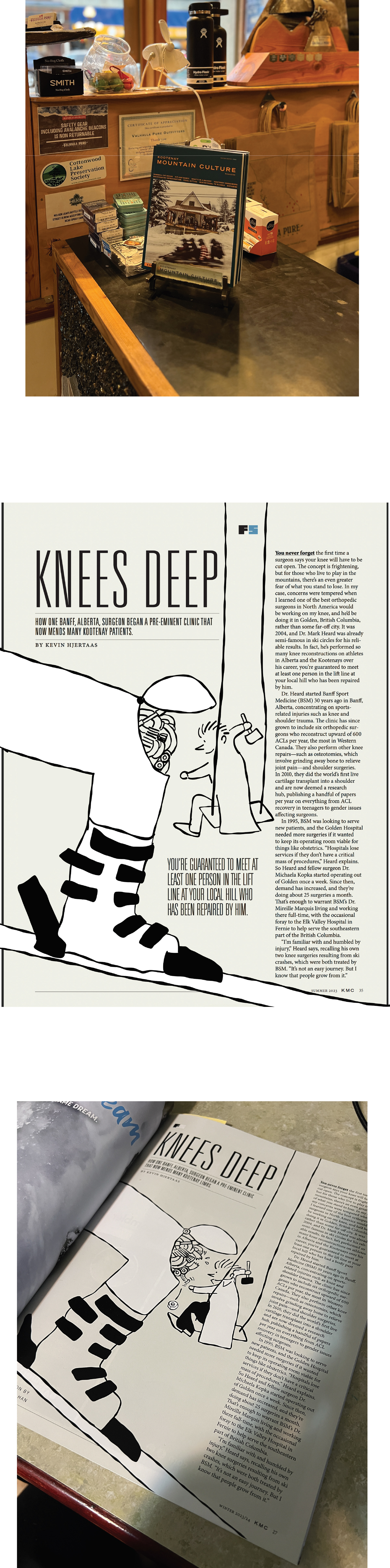 This design was selected by the editor through a competitive process for KMC Magazine (Kootenay Mountain Culture). The piece accompanies an editorial story focused on the experience of knee surgery—a subject that sits at the intersection of vulnerability, recovery, and mountain life. The visual approach is intentionally restrained, using minimal composition and negative space to mirror the physical and emotional tension surrounding injury and surgical intervention. The elongated forms and quiet layout invite the reader to slow down and reflect on the body’s fragility, particularly within a culture that values physical endurance and movement. By treating a medical experience with the same seriousness as an outdoor narrative, this work acknowledges how injury and healing become integral chapters in the lives of those who live and play in the mountains.