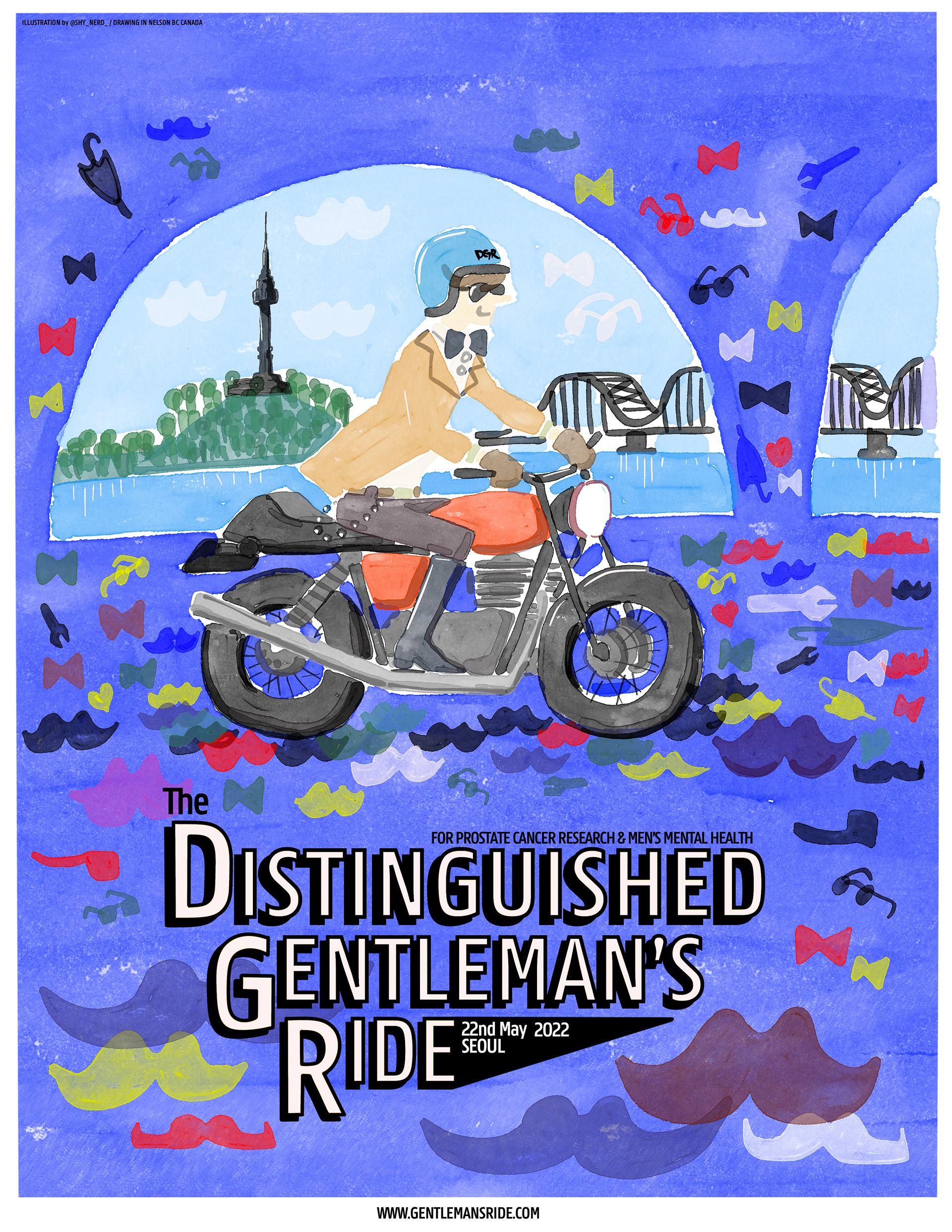 These posters were created for The Distinguished Gentleman’s Ride (DGR) events held in Korea. Each poster was designed to reflect the specific location where the ride took place, translating local landmarks and atmosphere into a whimsical visual narrative unique to each city. The playful illustration style was chosen to balance the elegance of the event with an approachable, celebratory tone, making the posters inviting to a broad audience. The designs were produced as limited-edition prints and distributed free of charge to participants and the public. Each poster measures 22 × 17 inches and was intended not only as event promotion, but also as a collectible object that captures the spirit, place, and community of each DGR ride.