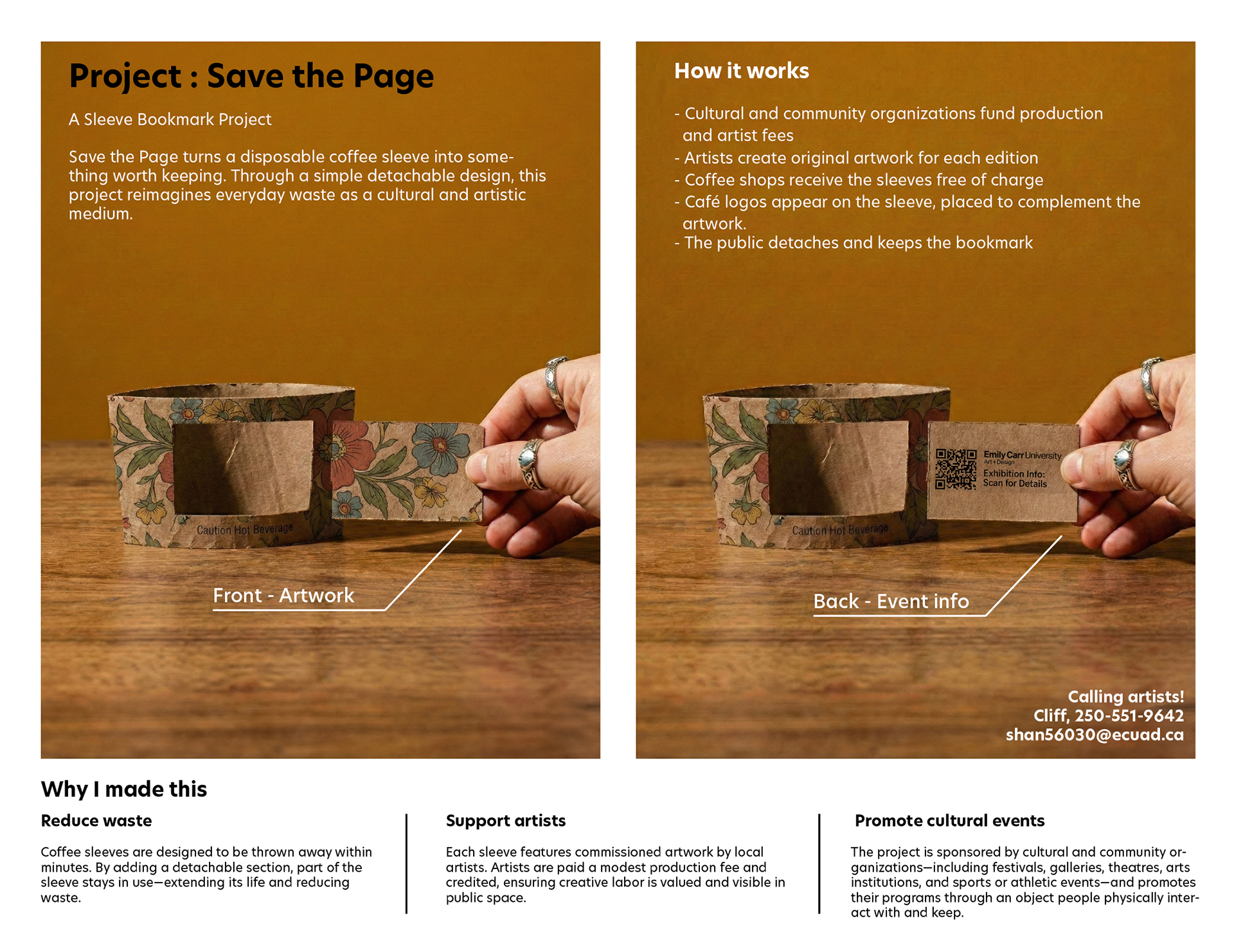 For years, I’ve carried the same question every time I pick up a coffee cup: “How can we stop this waste?” We all know the reality. Paper cups are difficult to recycle, and millions end up in landfills every day. But one day, I looked more closely at the cardboard sleeve in my hand. It’s paper. It has texture. And we hold it for 15–20 minutes—far longer than we look at most advertisements. That’s when a simple idea came to me: What if this wasn’t just trash, but a canvas? What if, instead of throwing it away, you kept it as a bookmark? That question became a project. I’m now launching Project Save the Page, an initiative that transforms single-use coffee sleeves into collectible bookmarks—while supporting local artists and bringing small cultural moments into everyday life. 🔨 Right now, I’m building the very first prototype. I’m experimenting with textures, perforation lines, and materials to make sure it feels natural, useful, and worth keeping. It’s a small piece of paper, but I believe it can spark a meaningful change—starting here in Vancouver. I’m currently looking for local cafés and artists who would like to collaborate on this journey. If you’re interested, I’d love to connect.