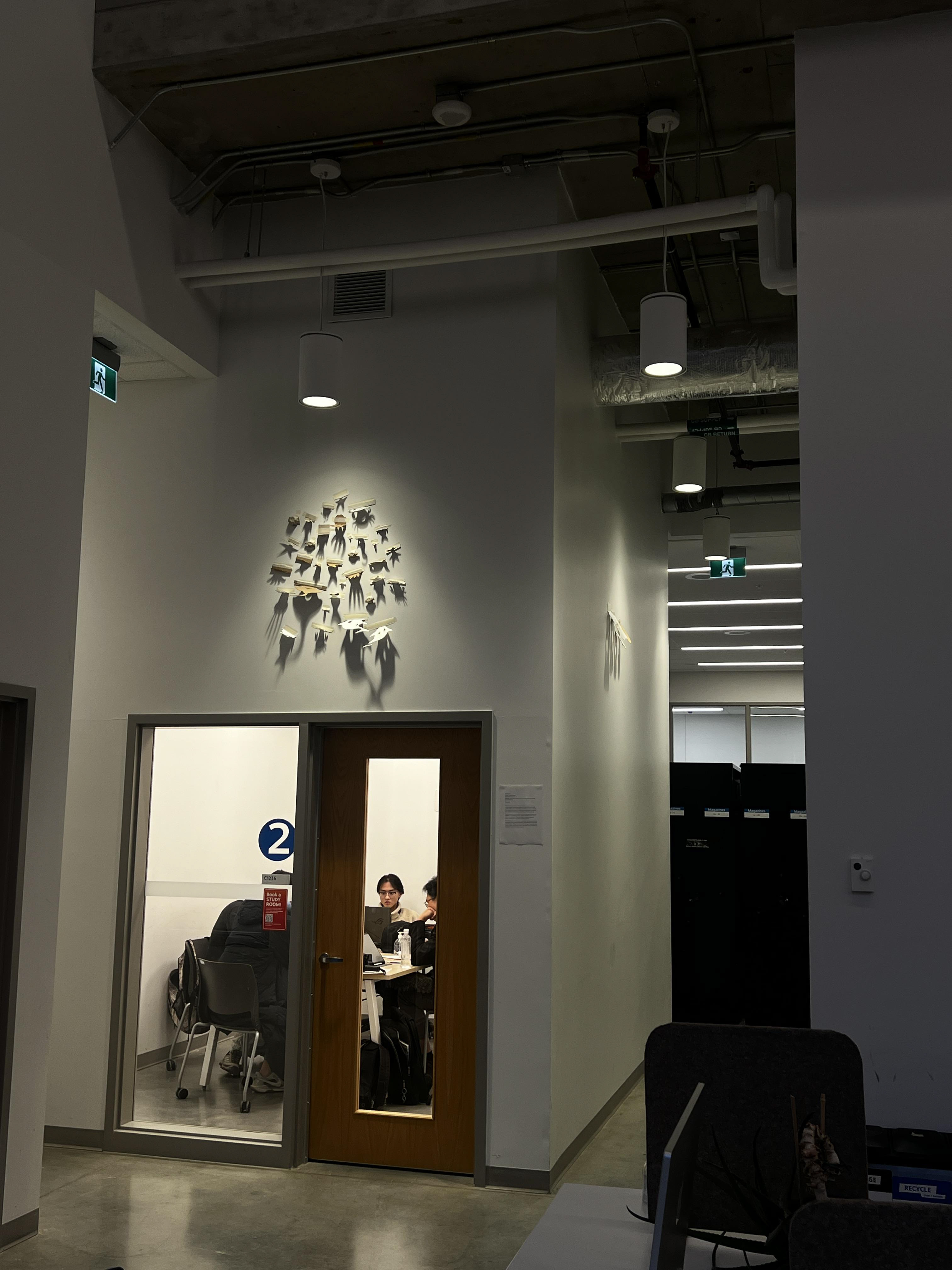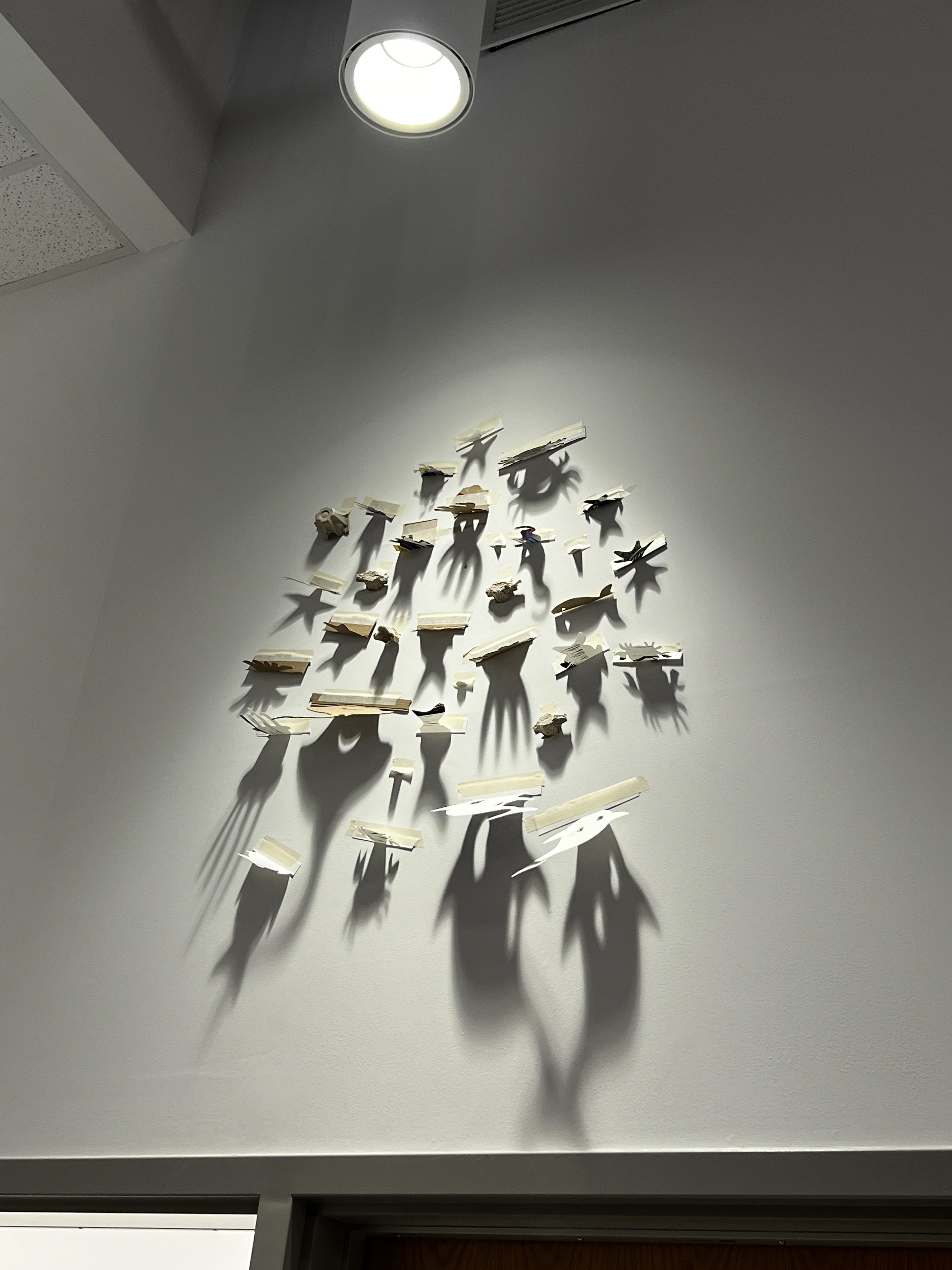 Masking tape, Recycled Paper collected in Emily Carr Univ. approx 1m x 1m, Installed in the Emily Carr University Library, the light animates the fragments, transforming a still study space into a whimsical, breathing ocean of light.