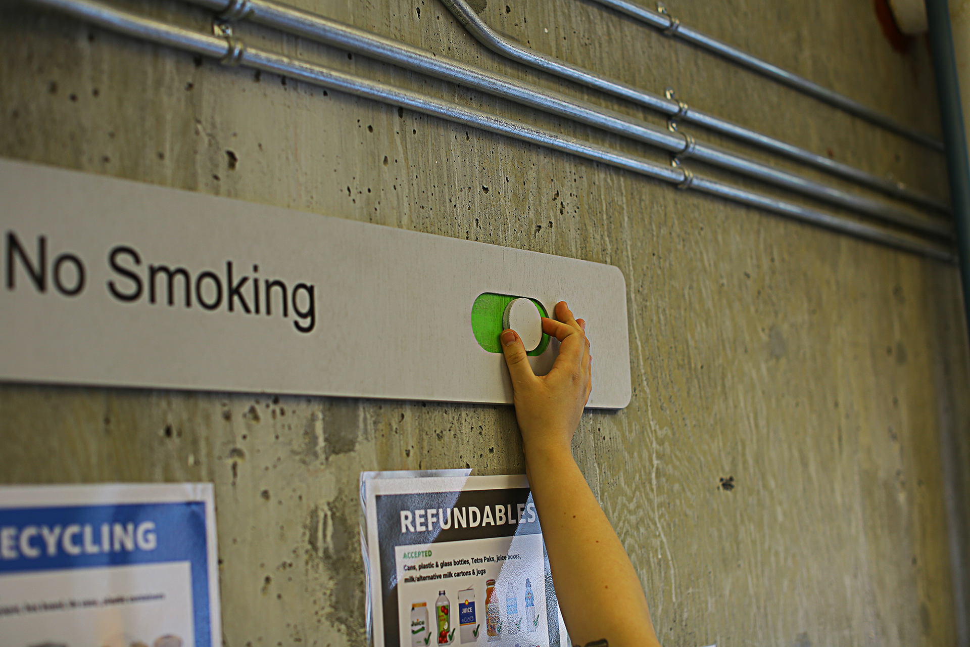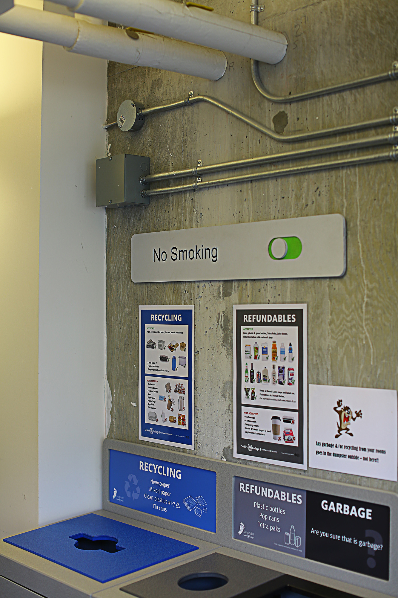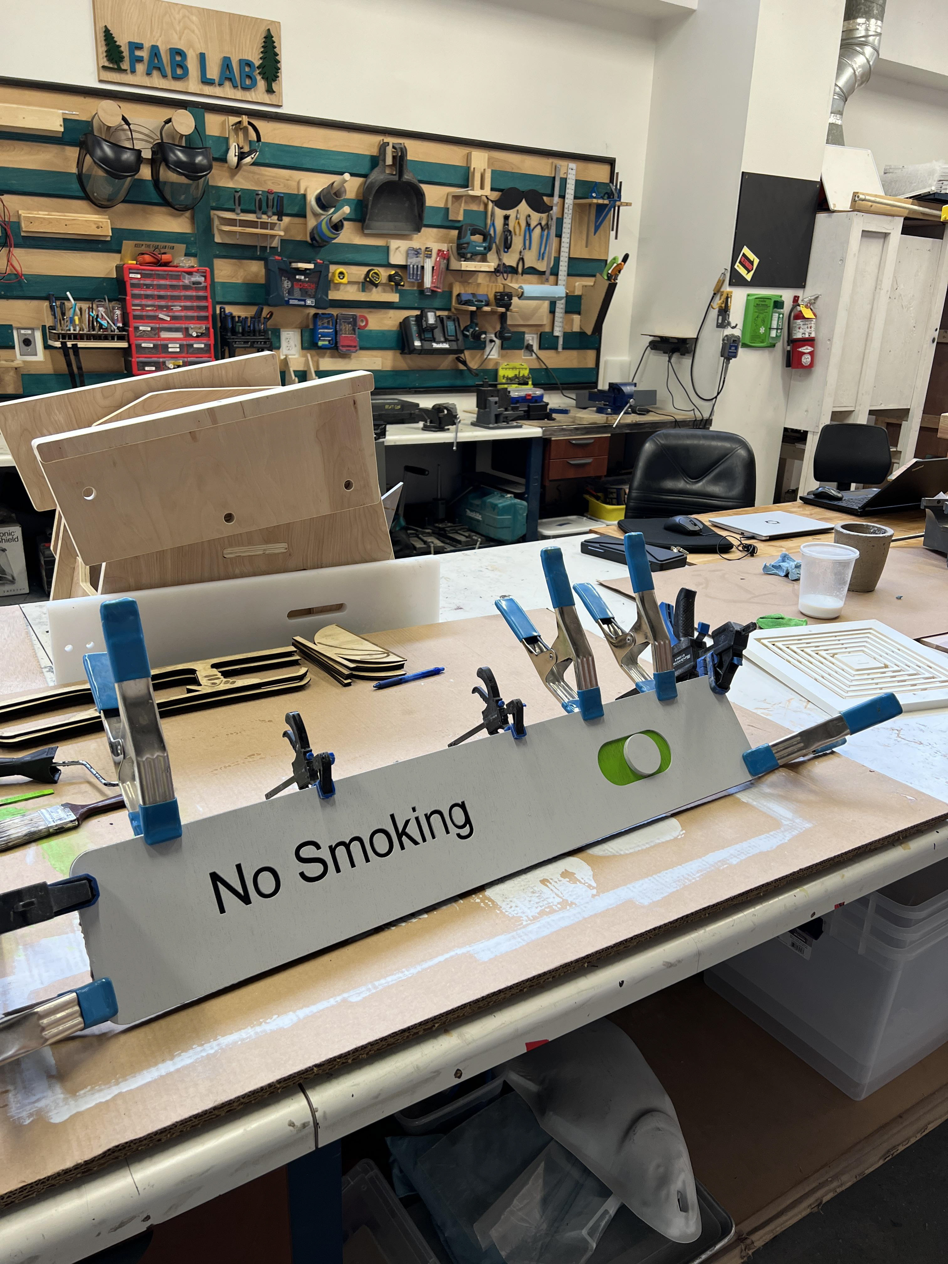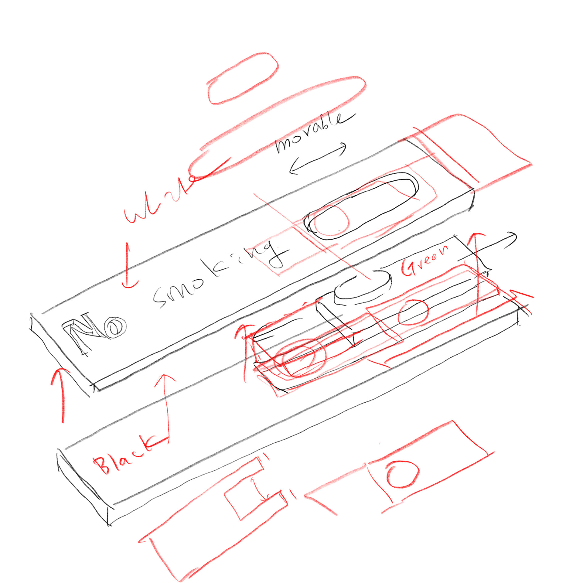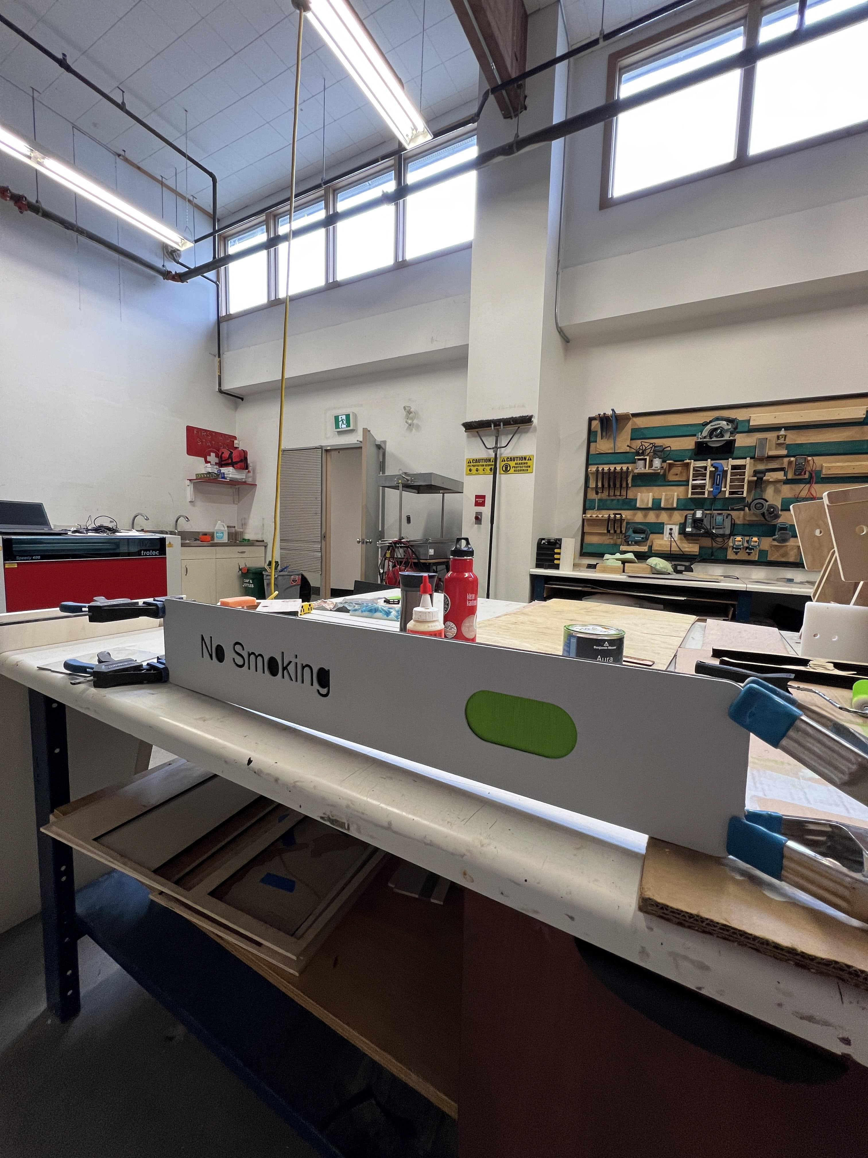 Plywood, 40inch x 15inch,Interactive “No Smoking” sign with a movable toggle that always returns to green, symbolizing a permanent no-smoking rule in the Selkirk College dormitory.
