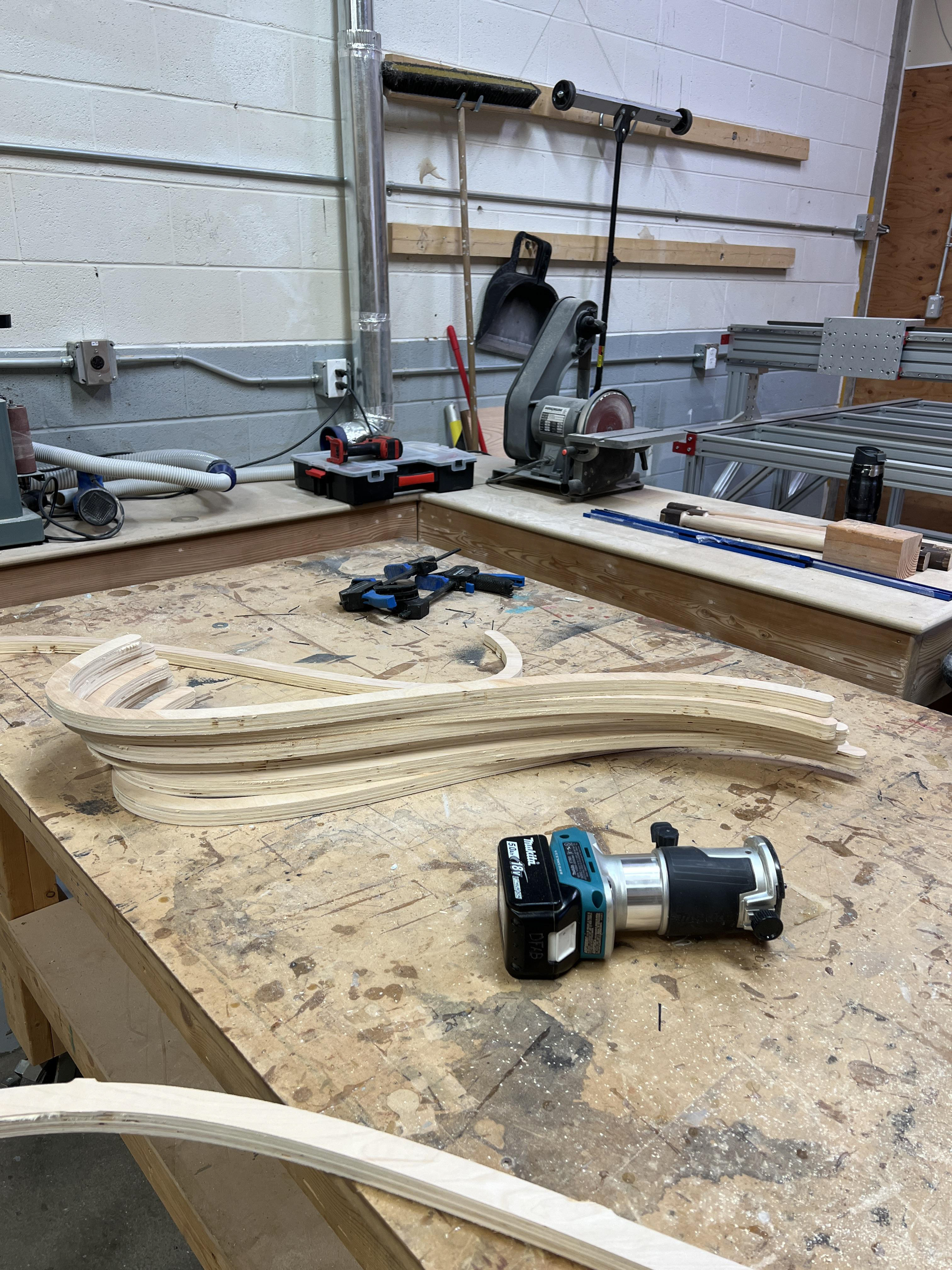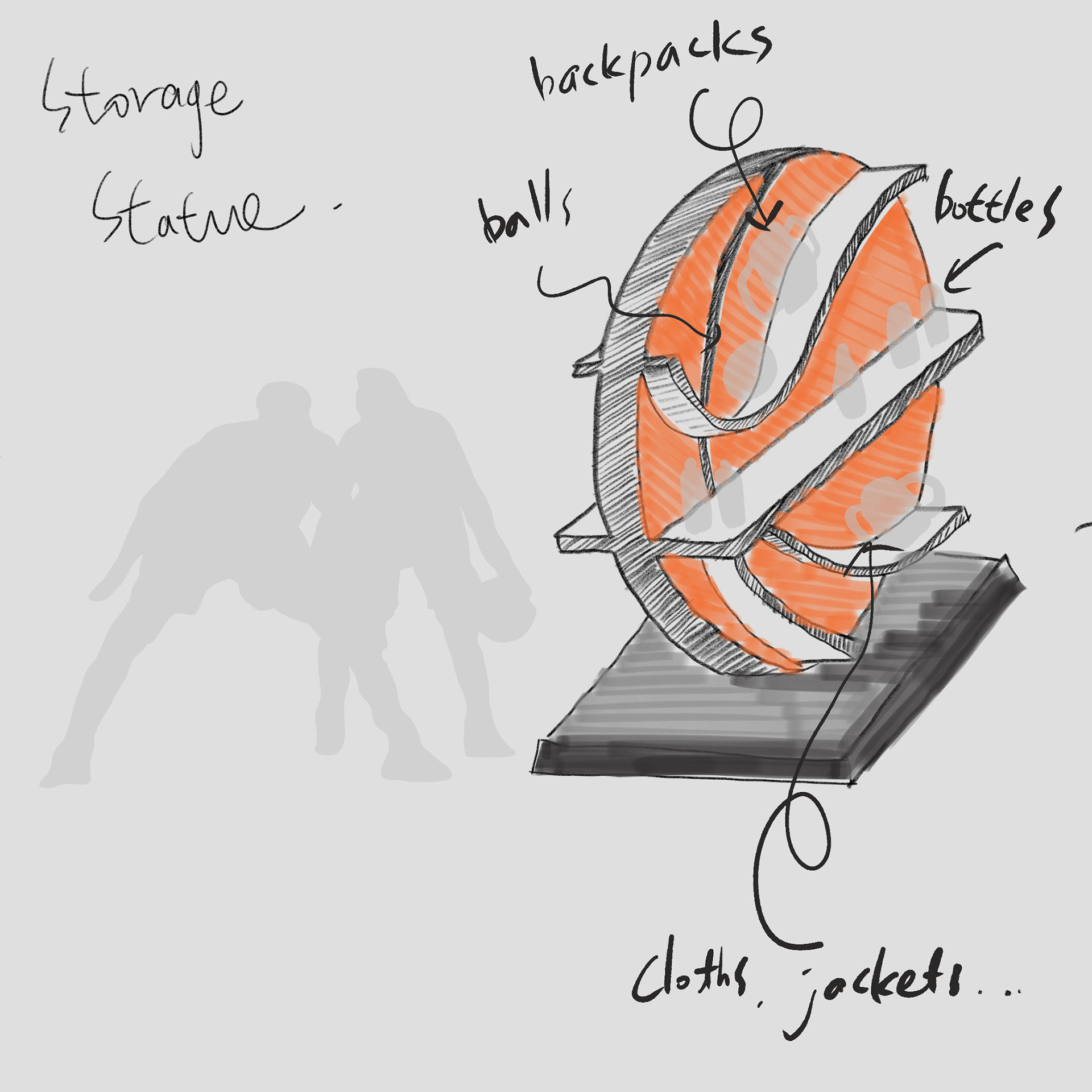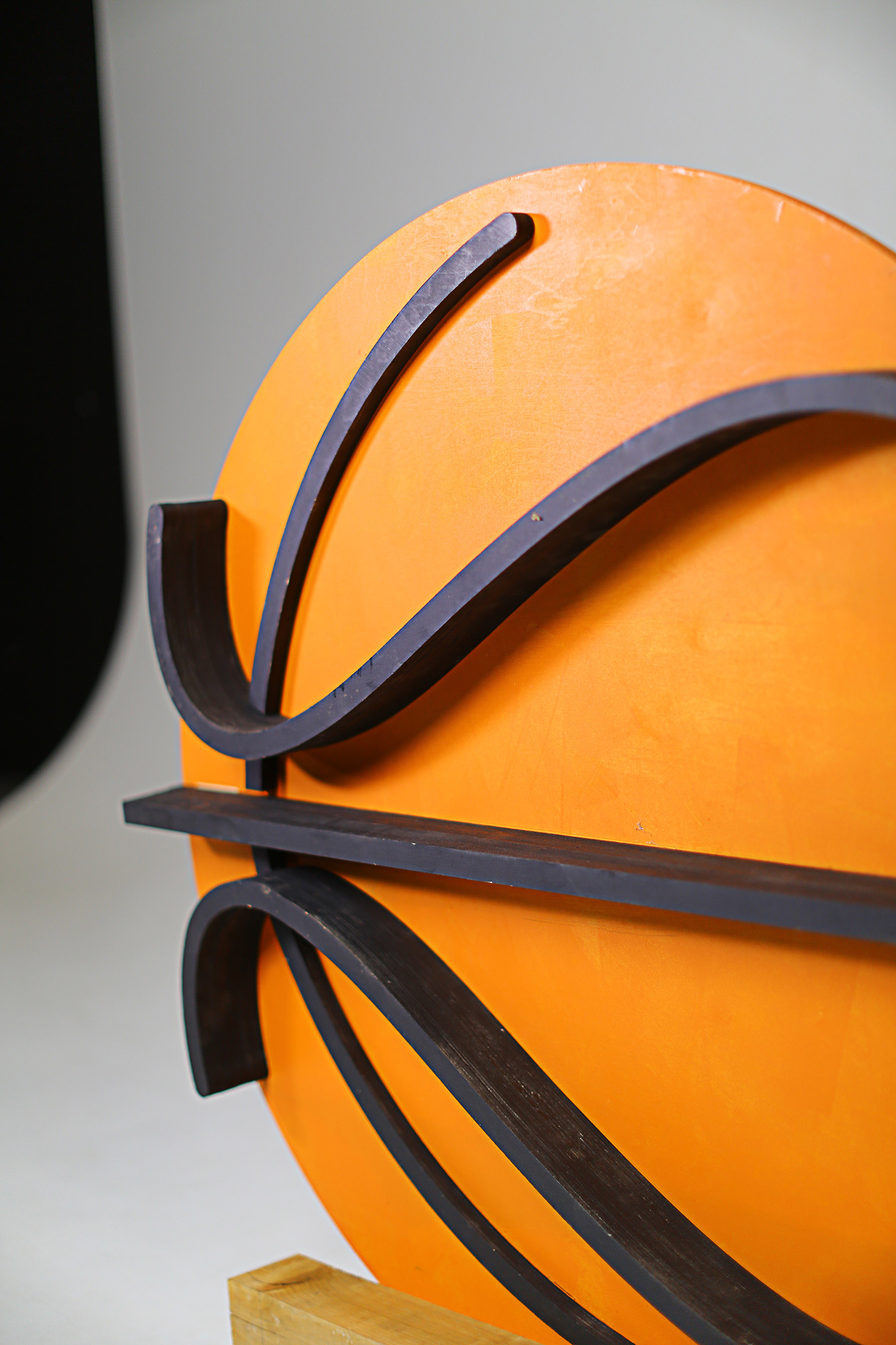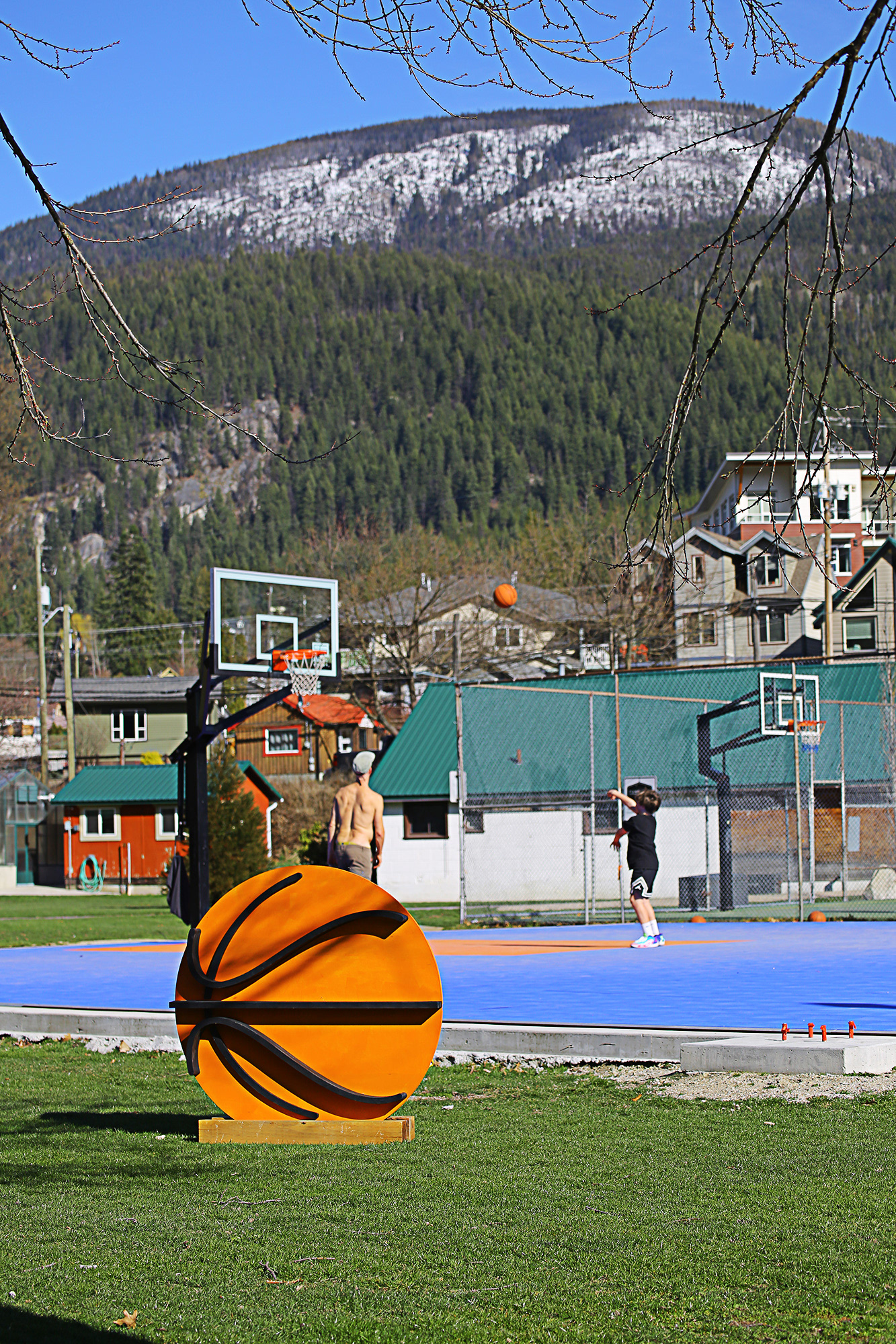 Plywood with CNC in STAC(Selkirk Tech Access Center), 4' by 4', A functional basketball-shaped signage installed at Lakeside Park, Nelson BC. The curved lines double as shelves, allowing players to store balls, bags, and bottles—turning signage into a community tool rather than a static object.