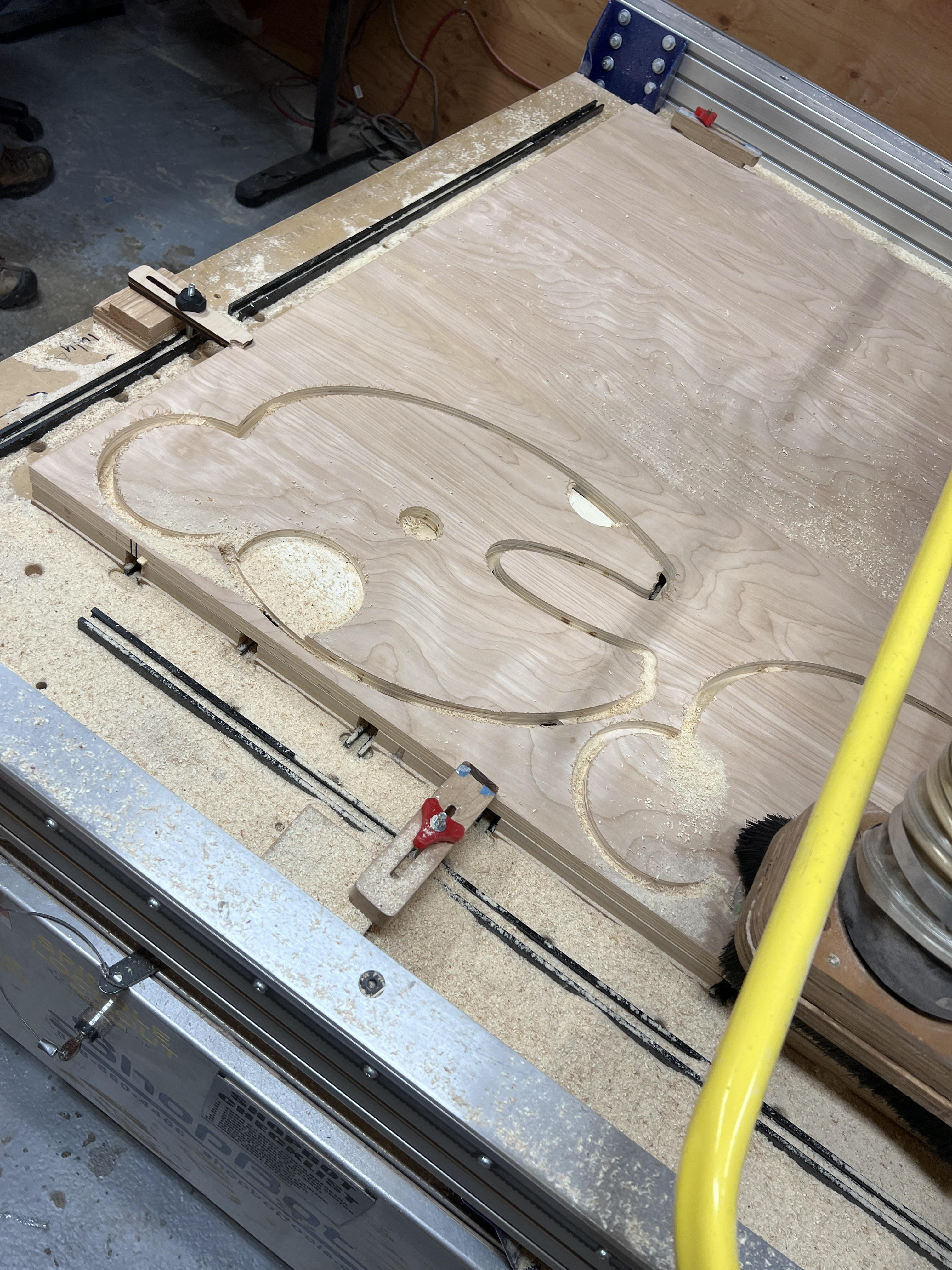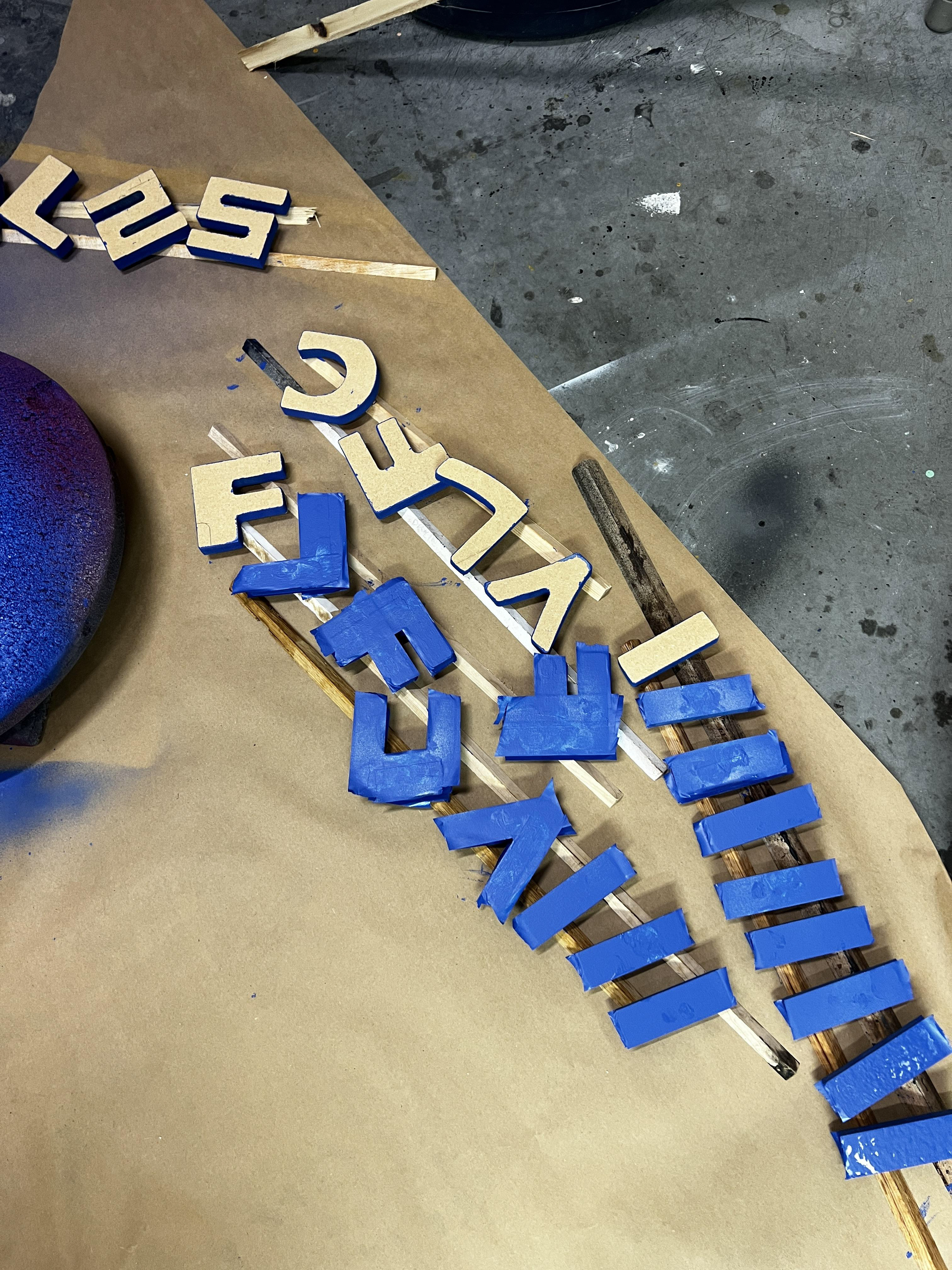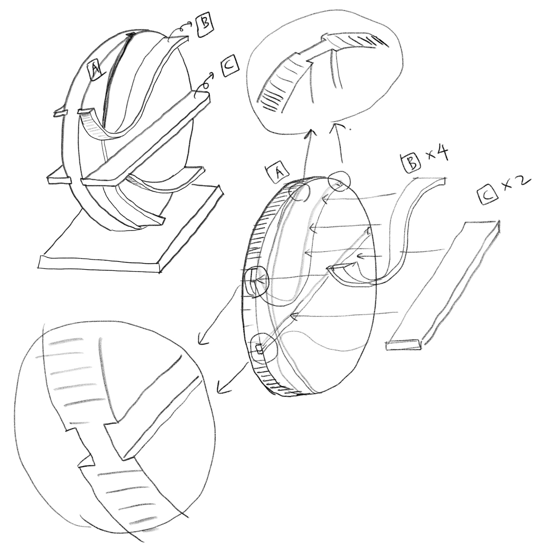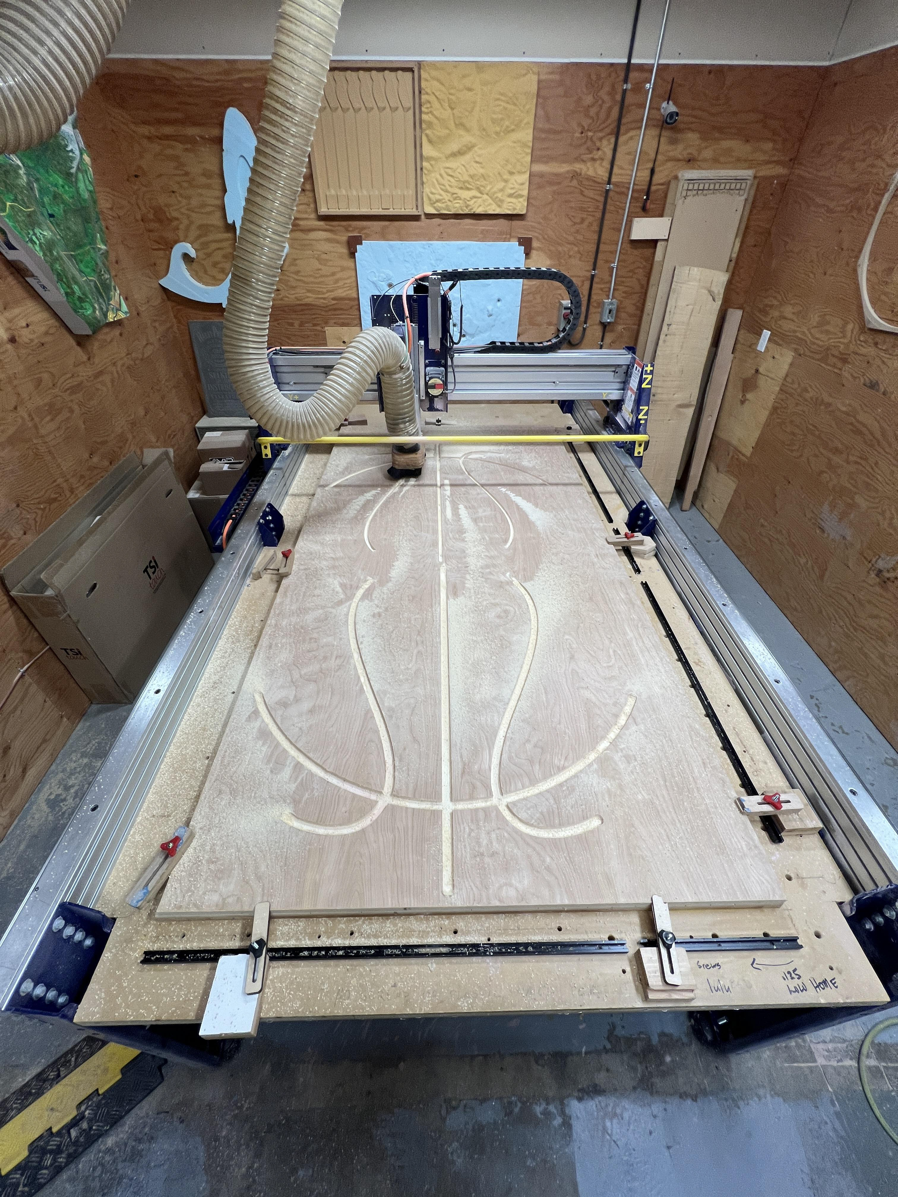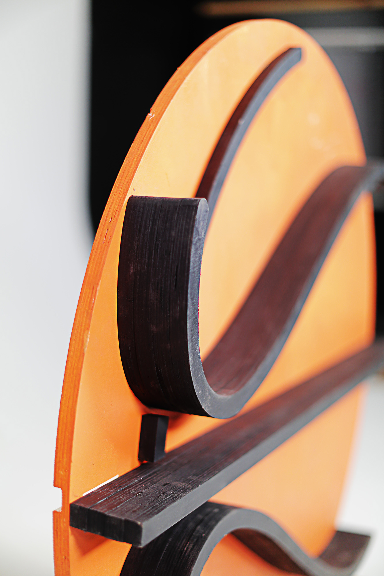 Plywood with CNC in STAC(Selkirk Tech Access Center), 4' by 4', A functional basketball-shaped signage installed at Lakeside Park, Nelson BC. The curved lines double as shelves, allowing players to store balls, bags, and bottles—turning signage into a community tool rather than a static object.