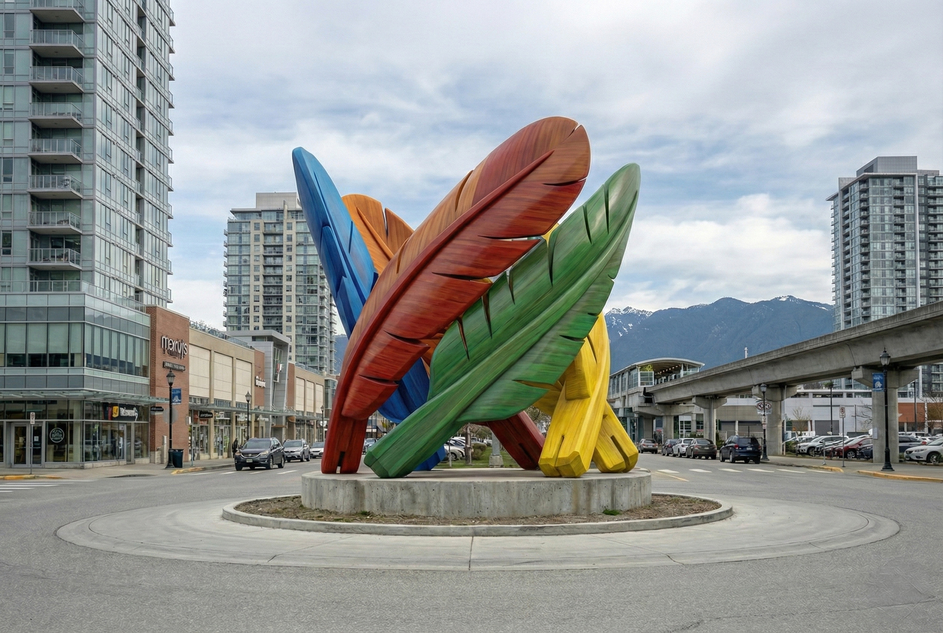 Project Description Public Art Proposal Rendering – Newton Roundabout, Surrey This rendering visualizes a site-responsive public sculpture proposed for the Newton Roundabout at 132 Street and 60 Avenue in Surrey, a highly residential area surrounded by parks, schools, and long-standing family neighbourhoods. The artwork is conceived as a calm yet distinctive landmark, experienced primarily by passing drivers, cyclists, and pedestrians viewing from the surrounding sidewalks.