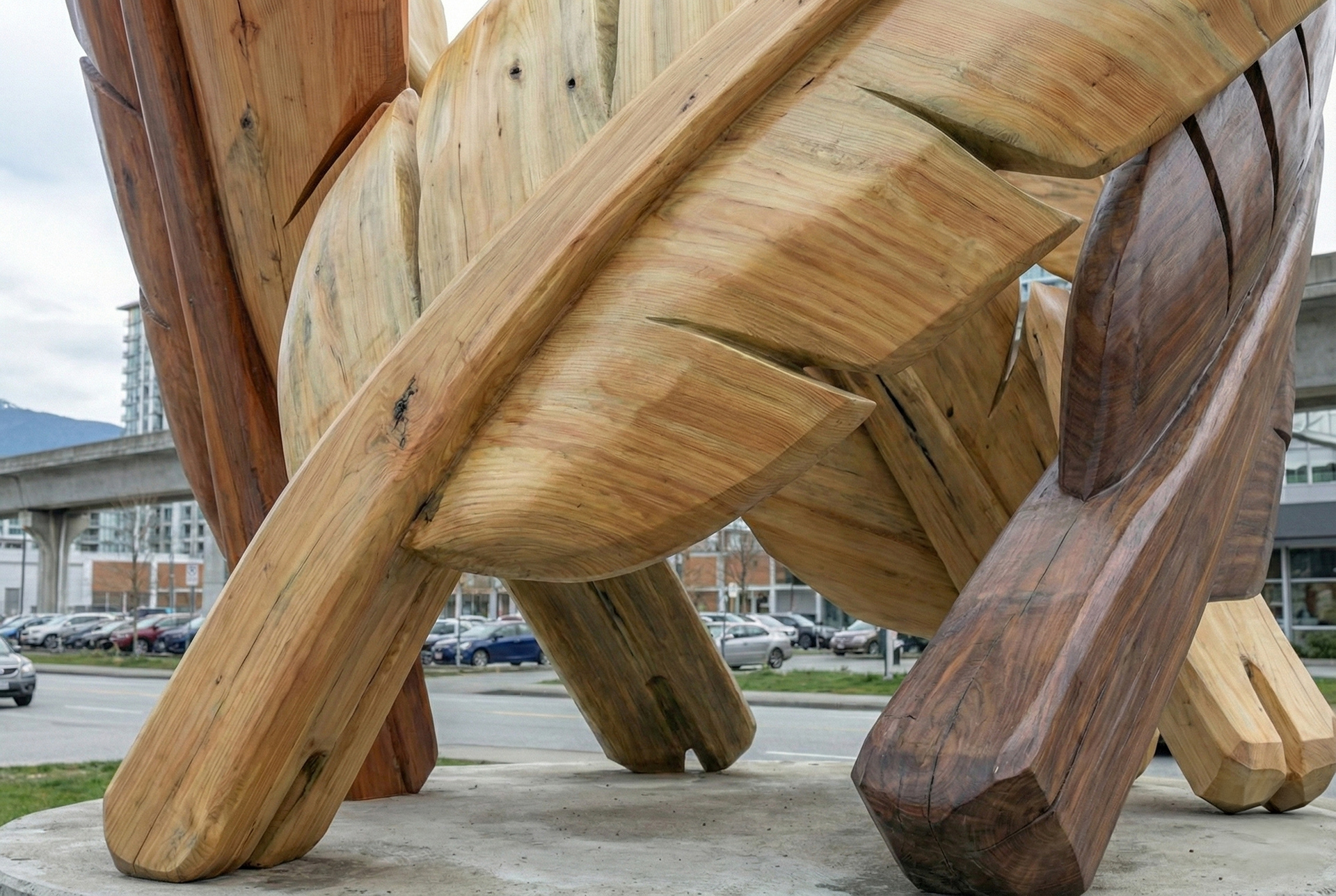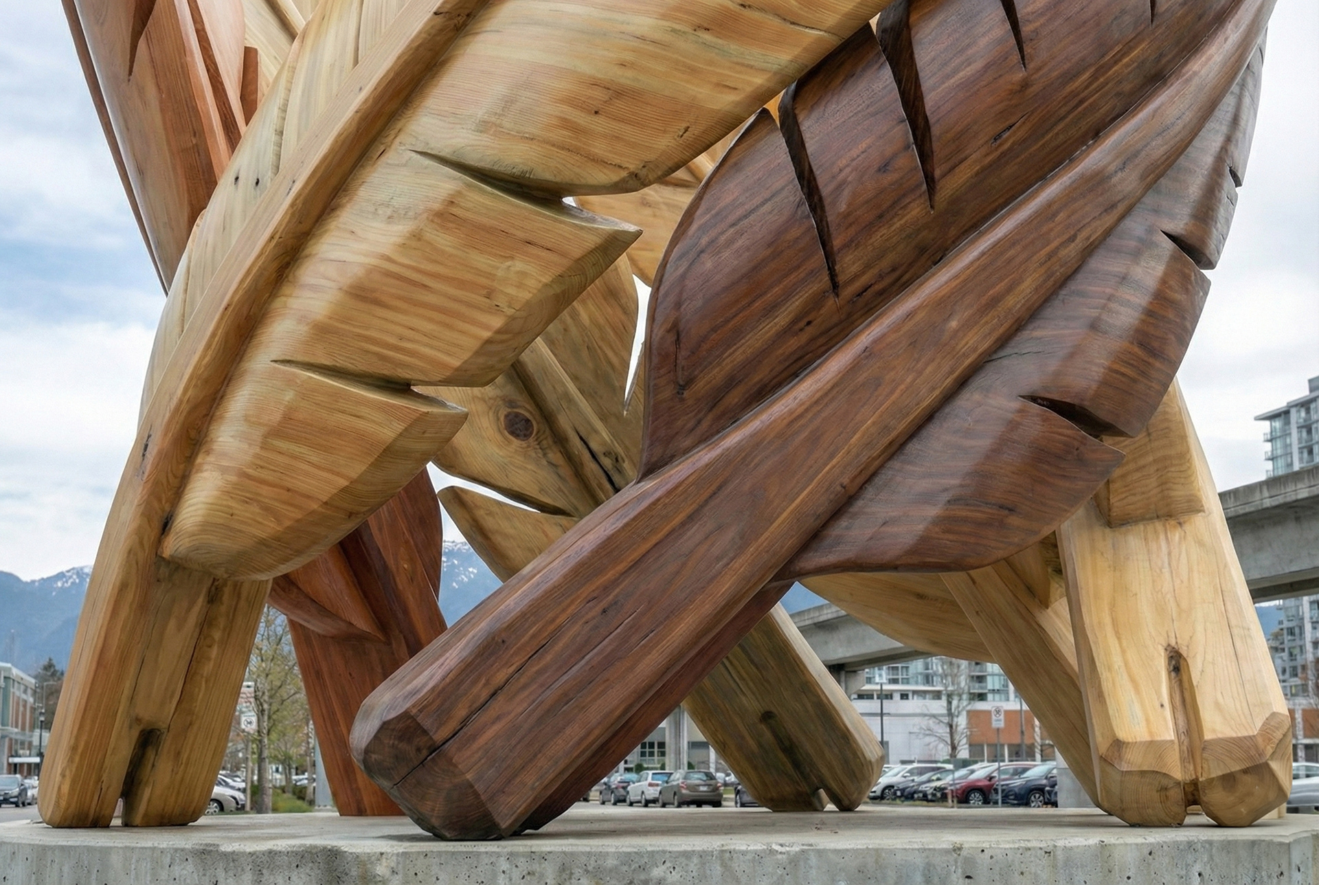 The sculptural form is composed of large, interlocking, feather-like wooden elements arranged in a circular, self-supporting composition. The overlapping geometry creates a sense of movement and balance, suggesting growth, protection, and interdependence—qualities that reflect both the natural heritage of the area and the lived experience of the local community. Concept & Inspiration The form draws inspiration from nature as a shared cultural language, using organic shapes rather than literal representation.